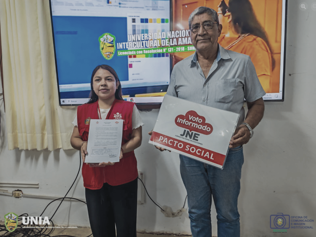 Esta mañana, en los ambientes del Vicerrectorado de Investigación, se llevó a cabo la firma del Pacto Social referente a las Elecciones Generales 2026 entre la Universidad Nacional Intercultural de la Amazonía (UNIA) y el Jurado Nacional de Elecciones (JNE), con el propósito de promover el voto informado y fortalecer la democracia en el país.La #UNIA estuvo representada por el Dr. Víctor Sotero Solís, vicerrector de Investigación y rector (e), mientras que el Jurado Nacional de Elecciones contó con la participación de Sharon Salas Mariluz, facilitadora e implementadora del programa Voto Informado del #JNE.
